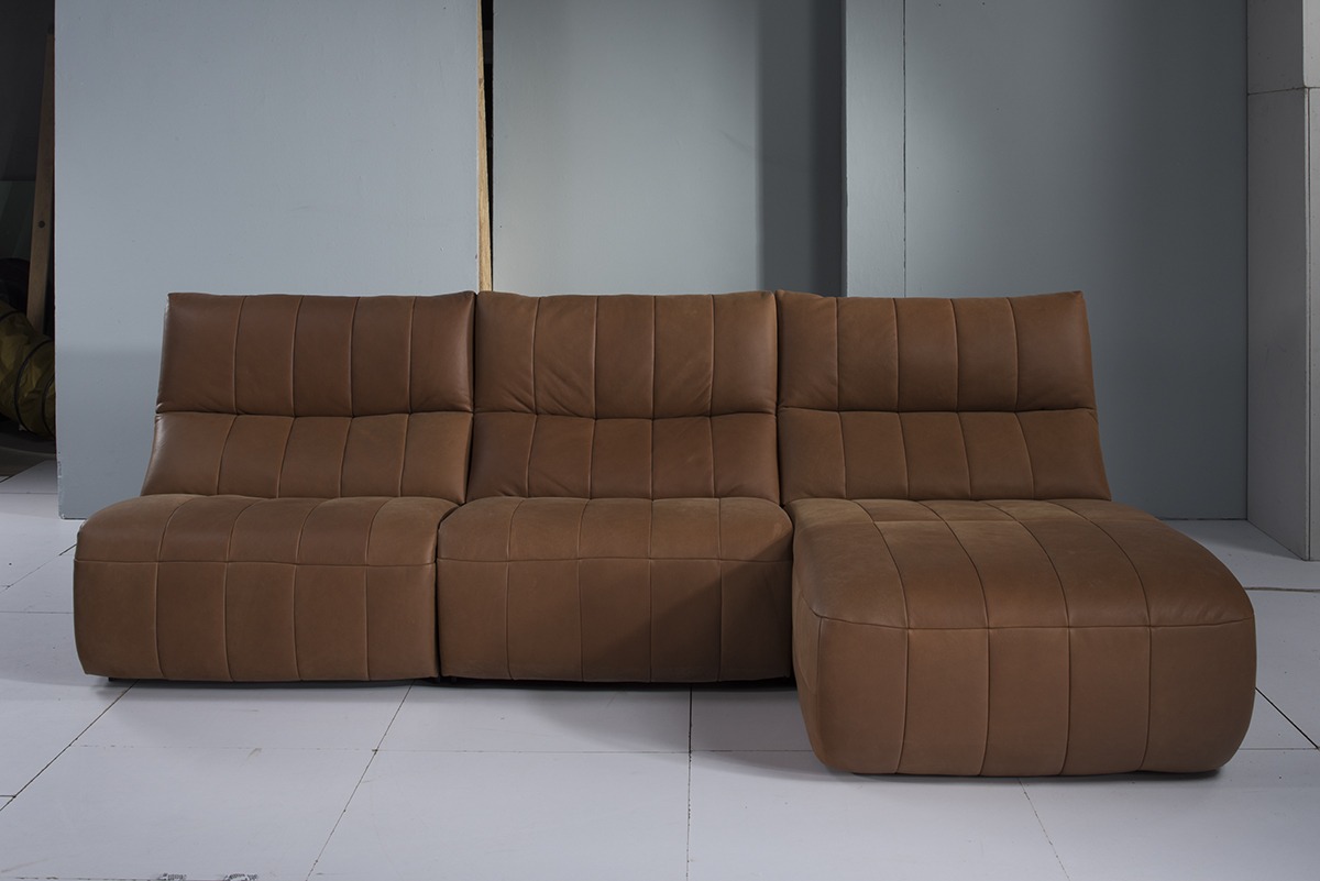Important leather characteristics: Because the covers of this model are made from vertical leather panels, slight shifting of the panels may occur—especially with aniline or lacquered leather types. Aniline leather has an open structure, making it sensitive to humidity and environmental factors. Leather weight (0.9–1.5 kg per m²) may also affect the filling, sometimes creating a flatter look compared to the same model in fabric.
