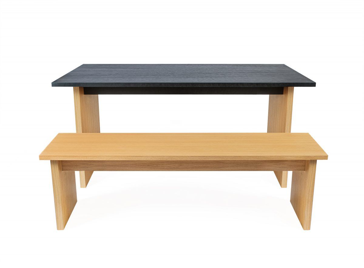 Dining table made of oak veneered particleboard (PLP22). Base is made of oak veneered plywood. Solid oak legs. All parts stained black and covered with matt clear varnish. Height from floor to base is 65cm. Accommodates 6 persons. Easy assembling: just install legs using M6 bolts(included).