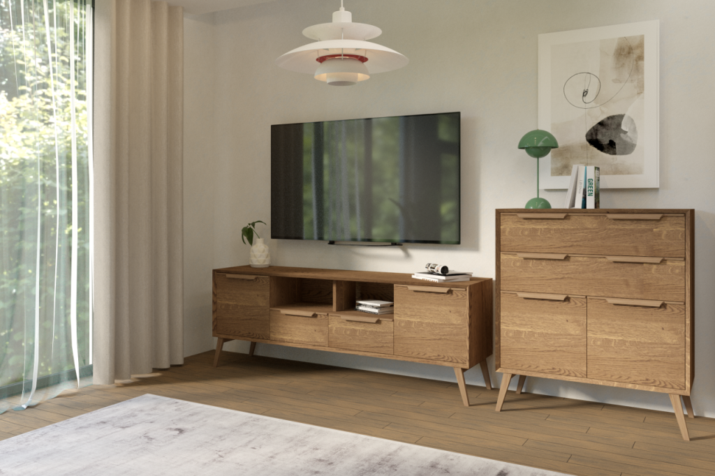 The chests in the LEO collection are elegant and spacious, fitting perfectly into any modern interior. Made of solid oak wood in artisan oak, they look very stylish and elegant. The Leo collection offers chests of drawers – with doors and drawers that provide plenty of space for storing various items. Thanks to their simple yet elegant design, the chests of drawers in the LEo collection are the ideal choice for people who appreciate functionality and aesthetics.
