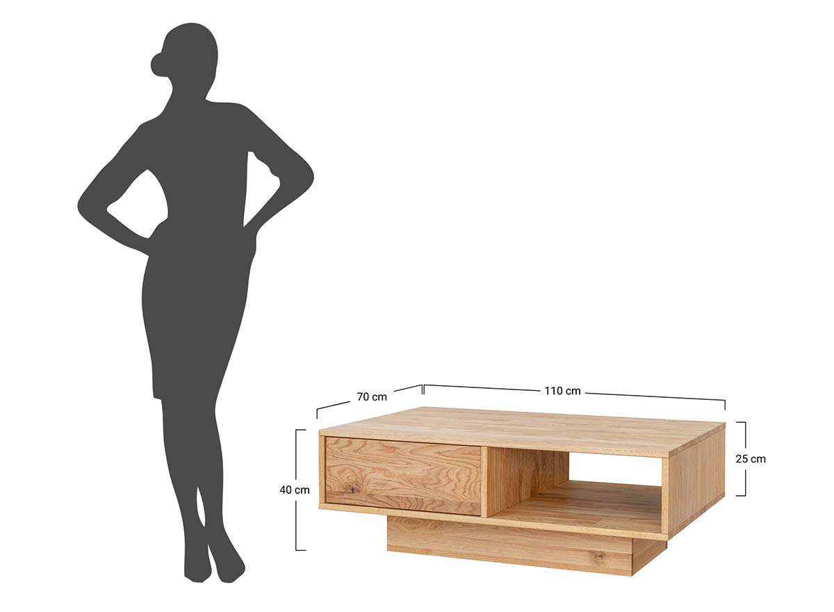 The coffee table from the Collodi collection radiates natural warmth, thanks to the golden hue of oak. The visible grain and knots affirm its authenticity and give it a unique character. The solid upper top in a classic shape is perfectly complemented by a lower shelf for practical storage. Between them lies an open niche that adds visual lightness, as well as a spacious drawer for smaller essentials. This coffee table fits beautifully into minimalist, Scandinavian, or more traditional interior settings.