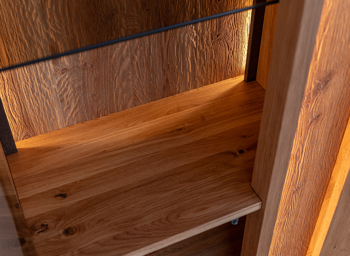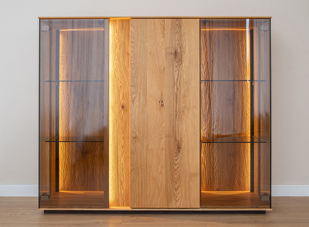 The oak used in the Collodi display cabinet ensures outstanding durability and aesthetic appeal. The oil finish enhances the wood’s natural beauty, revealing its texture and depth while protecting it from damage. Thoughtful craftsmanship guarantees that the cabinet will maintain both functionality and elegance for many years.