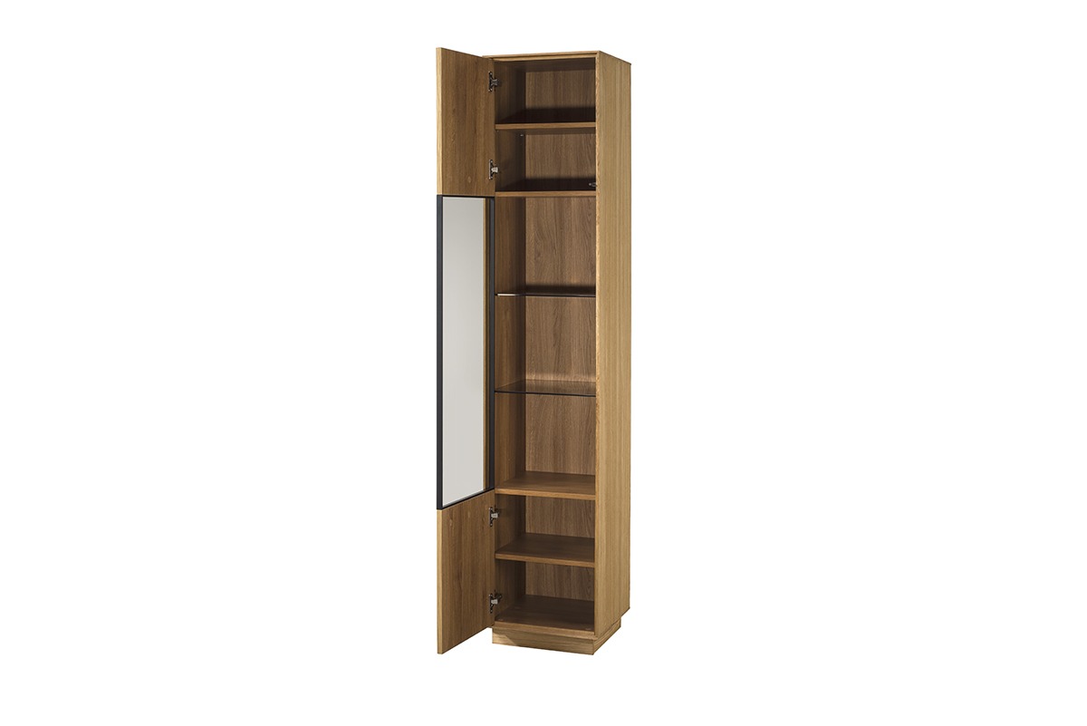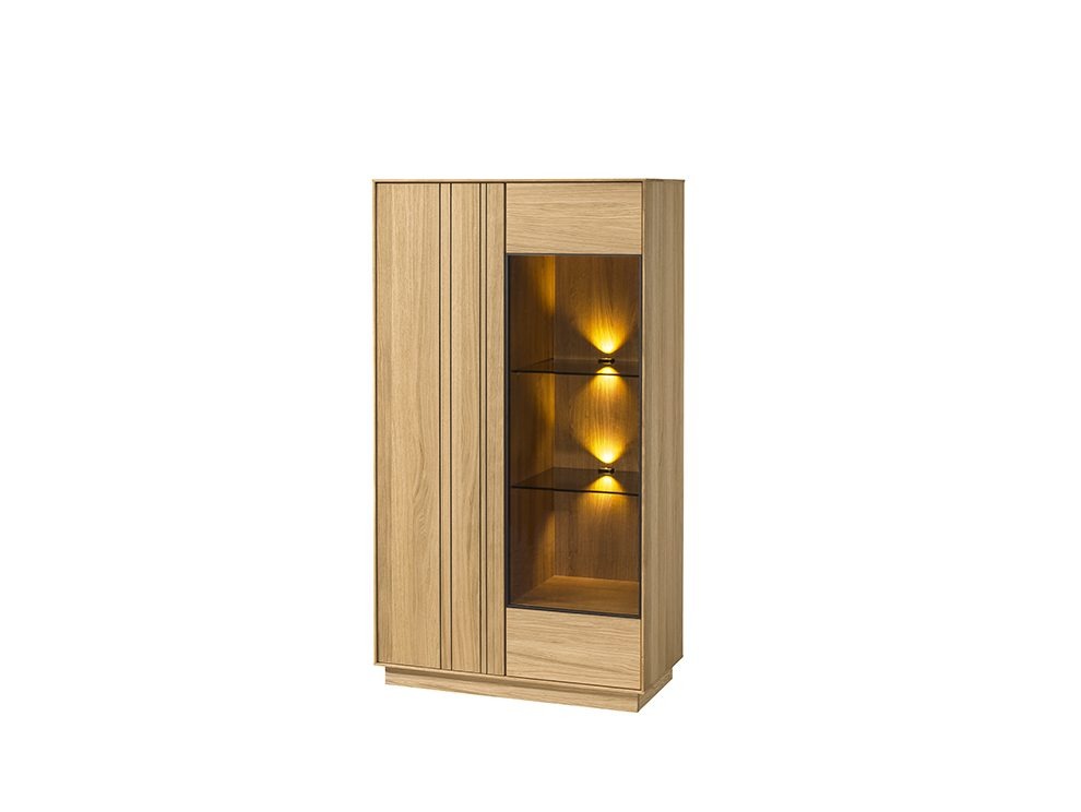 The Join collection’s 1-door display cabinet combines the warmth of natural oak with modern elegance. The front is finished with natural oak veneer, while the body features oak veneer on the outside and laminated board inside, ensuring durability and easy maintenance. Soft-closing hinges provide comfort, while the glass door section offers the perfect way to showcase decorative pieces or tableware. Its slim design makes it suitable for both compact and spacious interiors.