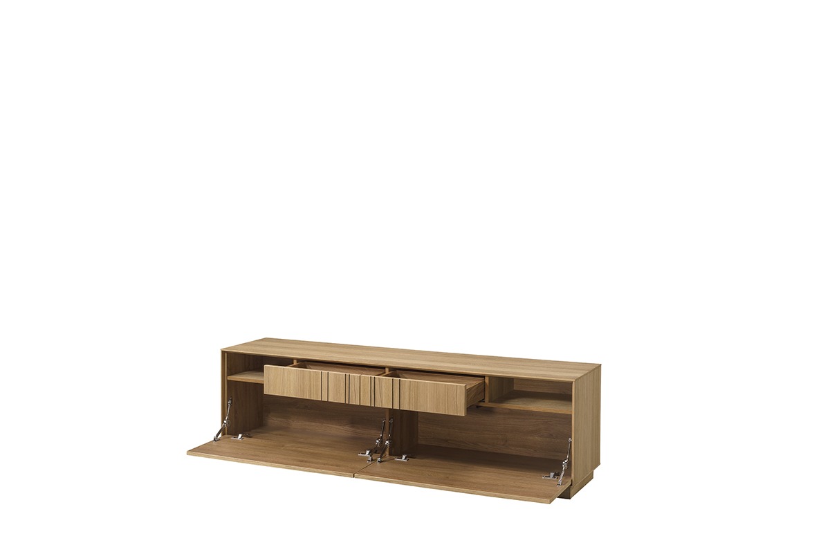 The Join TV stand combines modern design with the natural warmth of oak. The front and external body are made of natural oak veneer, while the inside is finished with durable laminated board for practical everyday use. An oiled surface protects the wood and highlights its grain, while soft-closing hinges and runners provide smooth and quiet operation. Optional lighting can be ordered separately. With two spacious drawers and two flap doors, the TV stand offers both style and functionality for your living room.