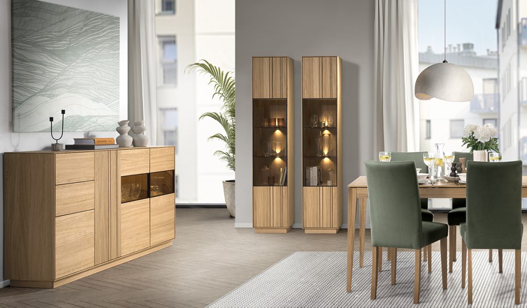 Join kolekcijas vitrīna ir eleganta un funkcionāla mēbele, kas harmoniski apvieno dabīga ozola siltumu ar modernu dizainu. Fasāde no dabīgā ozola finierējuma un eļļotā apdare izceļ koka dabisko rakstu, bet pašlēgšanās eņģes nodrošina ērtu un klusu lietošanu. Vitrīnas stiklotā daļa ir ideāli piemērota porcelāna, trauku vai dekoratīvu priekšmetu izstādīšanai, savukārt slēgtā daļa sniedz vietu lietām, kas nav paredzētas skatienam. Apgaismojumu iespējams pasūtīt atsevišķi.