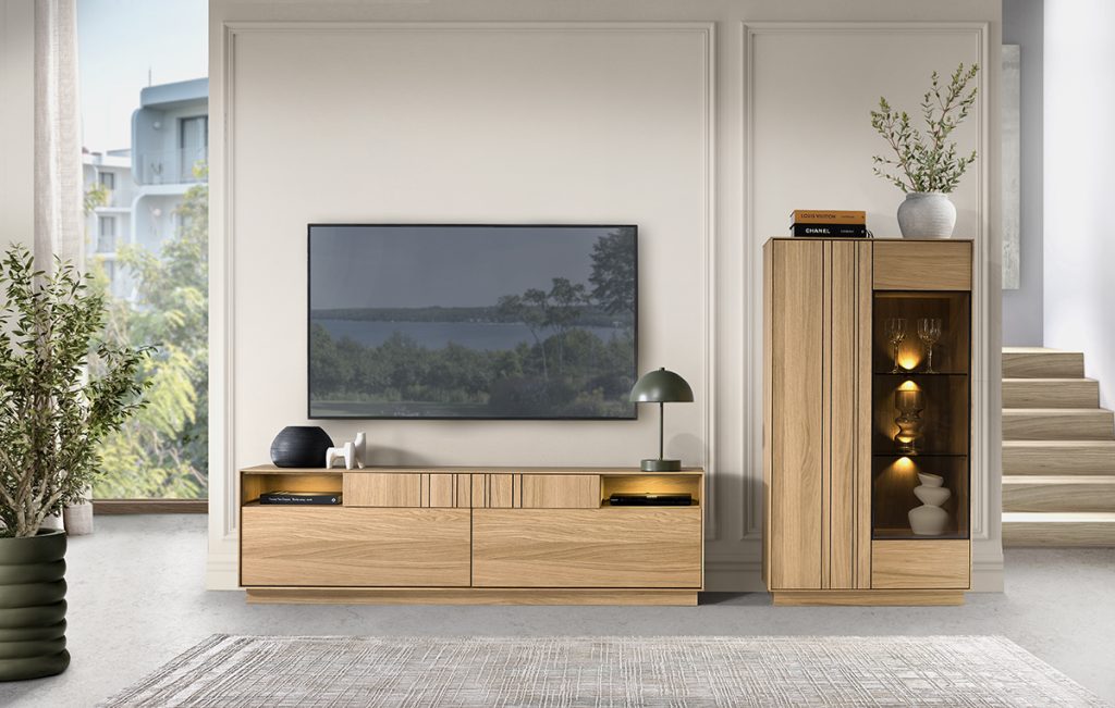 Join kolekcijas TV galds apvieno mūsdienīgu dizainu ar dabīga ozola siltumu. Dabīgais ozola finierējums fasādē un korpusa ārpusē izceļ koka tekstūru, savukārt laminētā iekšpuse nodrošina praktiskumu ikdienas lietošanā. Eļļotā apdare piešķir mēbelei izturību un viegli kopjamu virsmu. Pašlēgšanās eņģes un vadotnes nodrošina klusu un ērtu atvēršanu, bet apgaismojumu iespējams pasūtīt atsevišķi. Divas ietilpīgas atvilktnes un divas atmetamās durvis ļauj uzturēt kārtību un stilīgu interjeru vienlaikus.