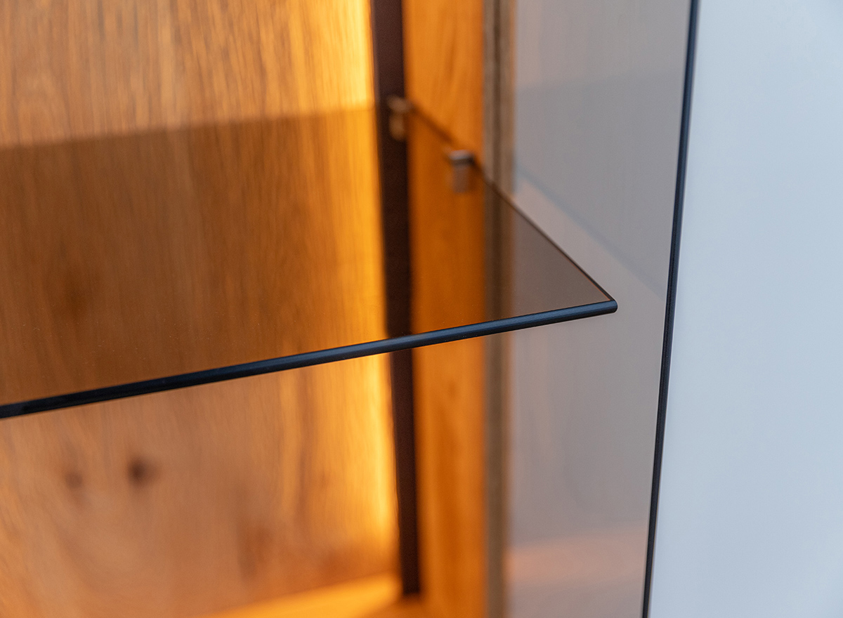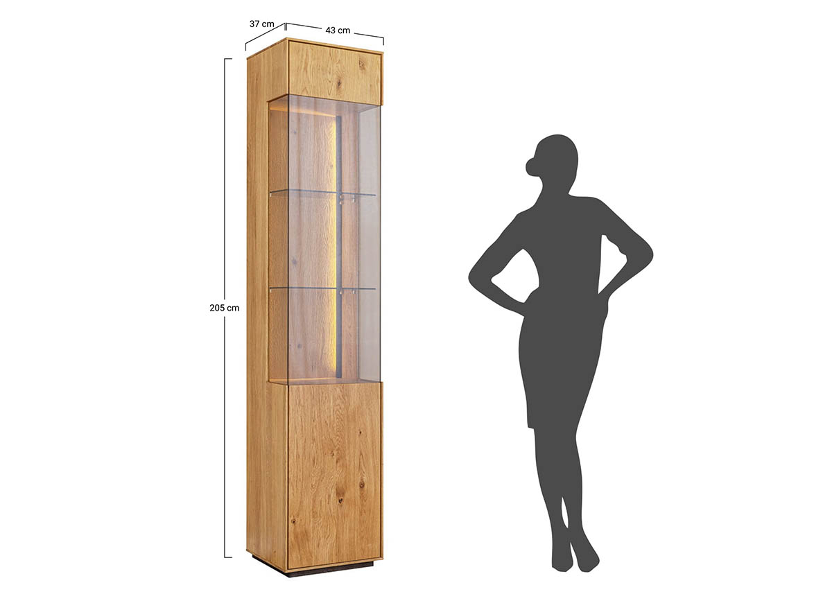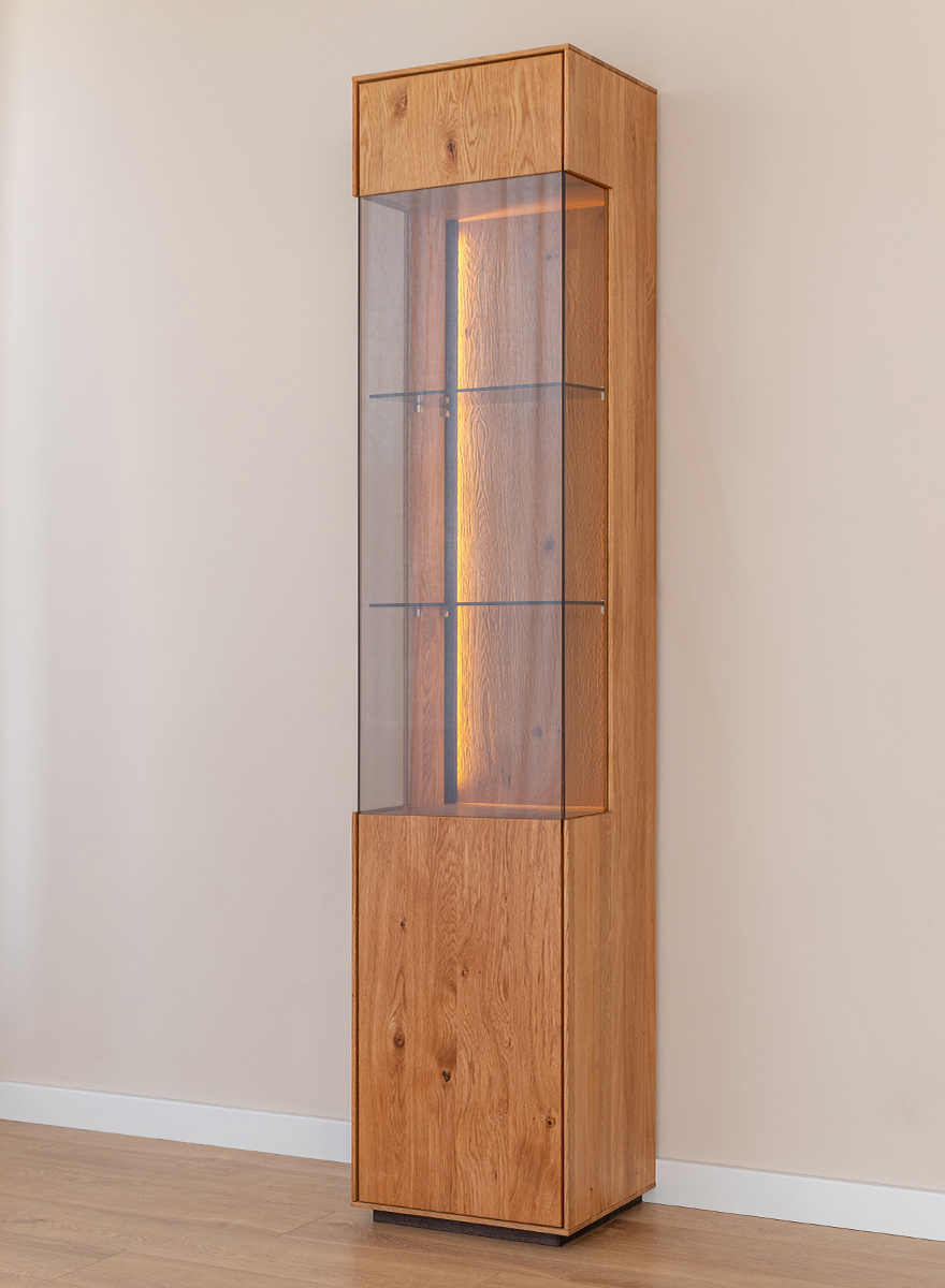 Представленная левая витрина — подтверждение нашего мастерства: изготовлена из первоклассного дуба с видимыми сучками и текстурой, придающими мебели аутентичность и уникальность. Этот элегантный и минималистичный дизайн прекрасно впишется в любой интерьер, добавляя ему благородство и вечность.