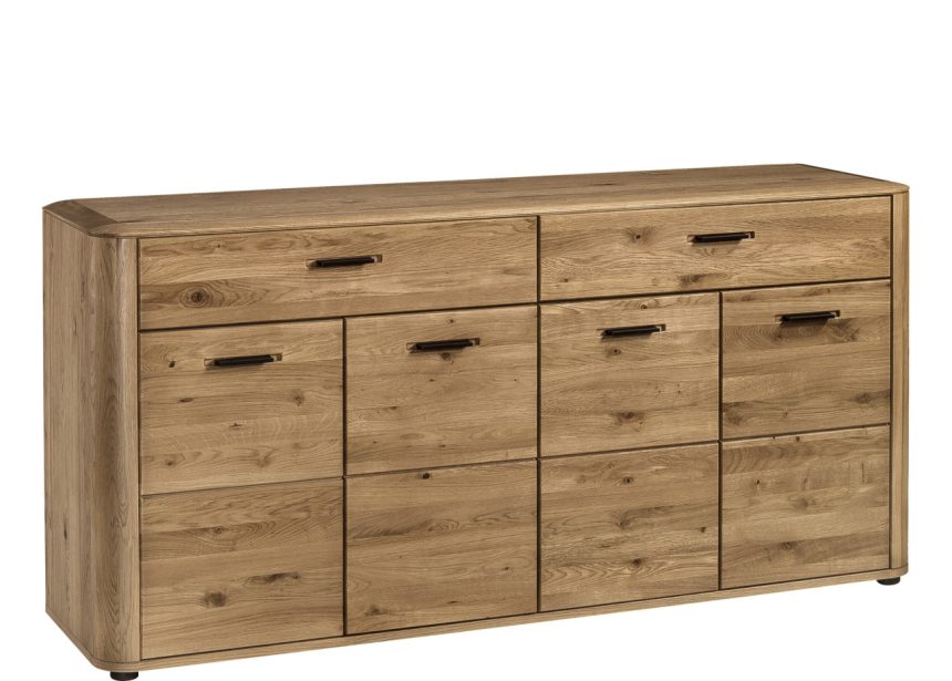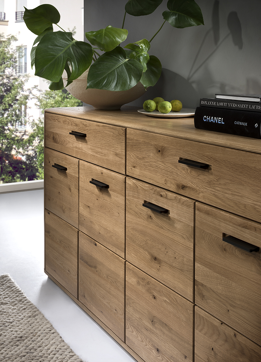 Большой дубовый комод Monaco Просторный комод, сочетающий элегантность натурального дуба с современным удобством. Четыре деревянные дверцы и два ящика обеспечивают достаточно места для хранения — от посуды до документов. Фасады выполнены из массива дуба, внешний корпус — из натурального дубового шпона с элементами массива, внутренняя часть — из ламинированной плиты цвета таёжного дуба. Чёрные металлические ручки и механизм мягкого закрывания делают использование комода особенно комфортным.