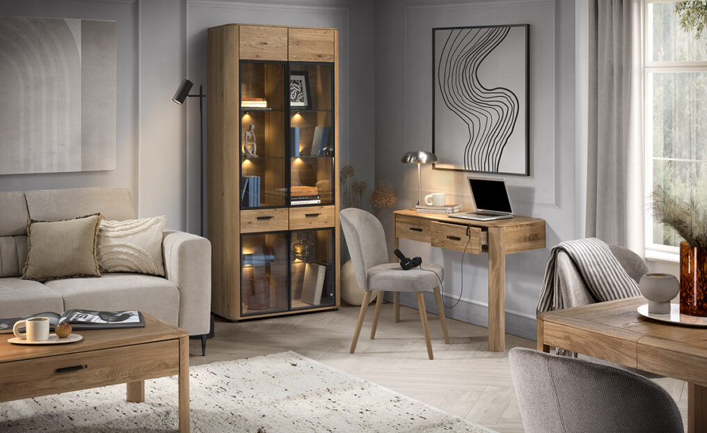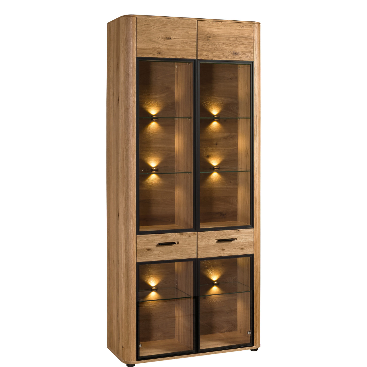 Витрина со стеклом и подсветкой Monaco Витрина Monaco удачно сочетает стиль и удобство. Две двери с комбинацией стекла и дуба создают идеальное пространство для демонстрации посуды, книг или декоративных предметов. Антисольное стекло и чёрные алюминиевые рамы придают современный акцент, а встроенная светодиодная подсветка с выключателем создаёт уютную атмосферу. Фасады выполнены из 100% массива дуба, внешний корпус – из натурального дубового шпона с элементами массива, внутренняя часть – из ламинированной плиты цвета таёжного дуба. Петли с доводчиками обеспечивают комфортное ежедневное использование.