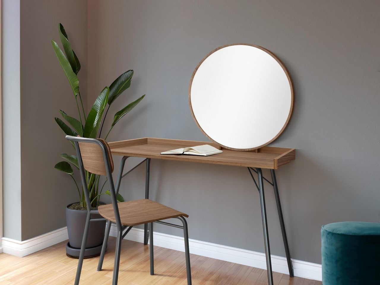 Rayburn ozola tualetes galds piešķir jūsu mājām mūsdienīguma pieskārienu. Viegli noņemams spogulis. Spoguļa stāvokli var viegli un ātri mainīt. Izgaismojiet savu telpu ar šo vienkārši šiksto akcentu, ar tīru oderi. Galda virsma ir izgatavota no ozolkoka finiera skaidu plātnes (PLP16,5). Spoguļa diametrs ir 71 cm.