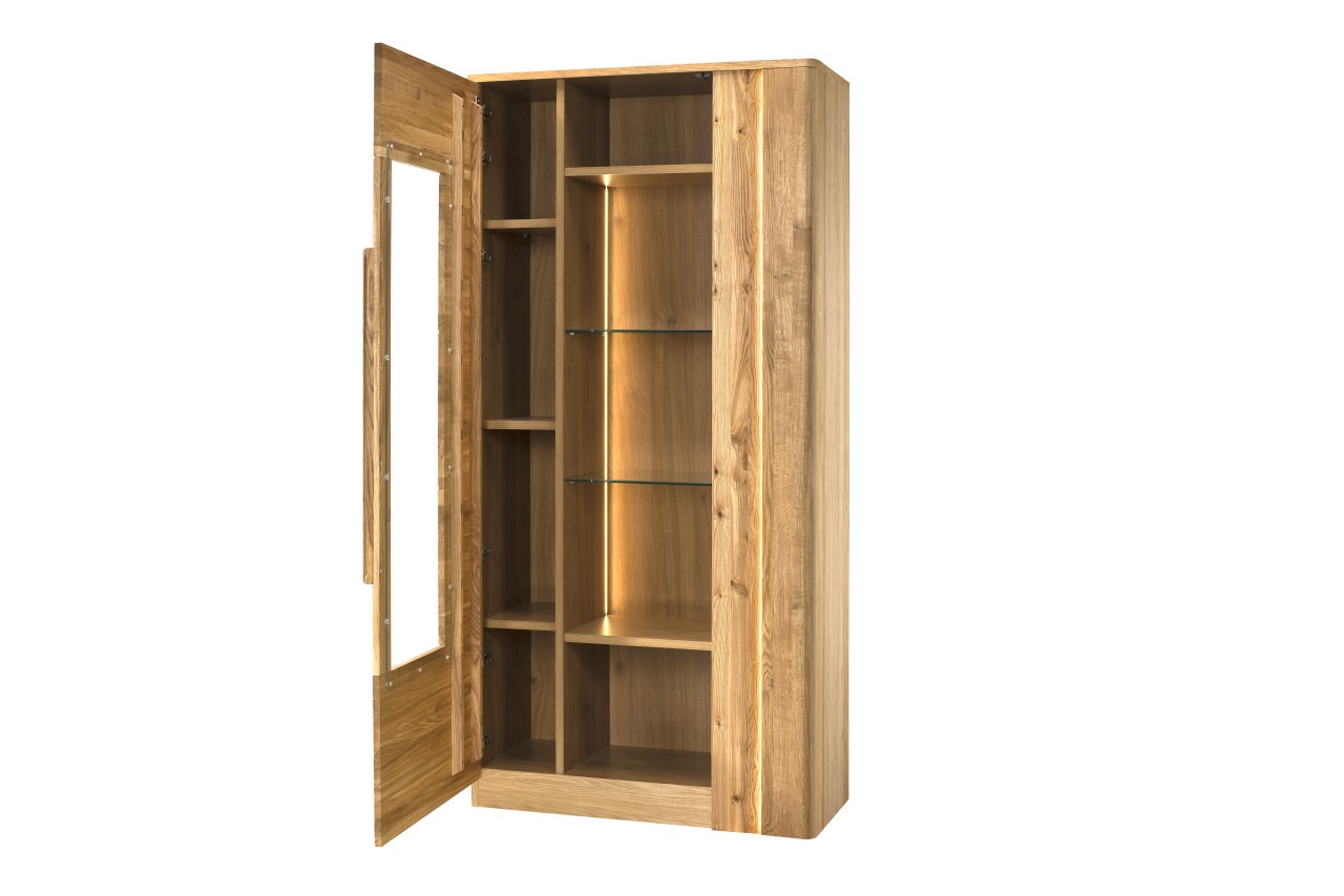 Plaša un ietilpīga vitrīna, kas lieliski piemērota gan dzīvojamām, gan reprezentatīvām telpām. Kvalitatīvi materiāli un dabīga eļļas apdare izceļ koka dabisko tekstūru. Masīvkoka ozola fasāde nodrošina ilgmūžību, savukārt rūdītā stikla plaukti ļauj droši izvietot dekorus un traukus.